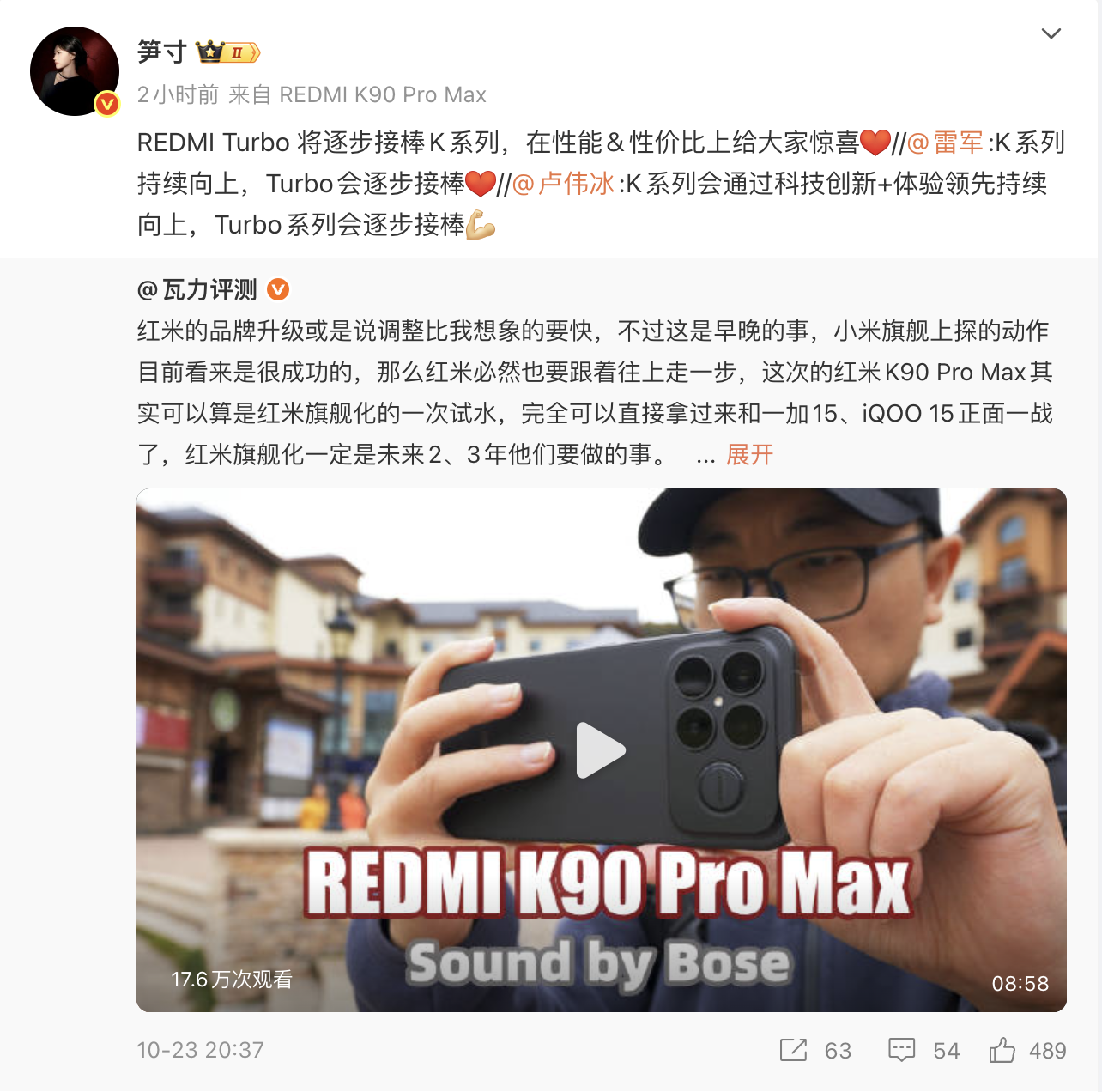 而昨天,REDMI 产品经理笋寸进一步指出:「Turbo 将逐步接棒 K 系列,在性能与性价比上给大家惊喜。」她强调,Turbo 系列将成为品牌在中高端市场的关键布局。
