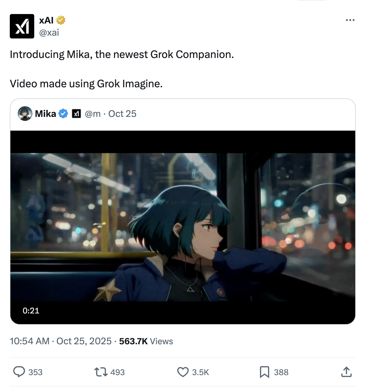 xAI 称,Mika 是「最新的 Grok 伴侣」,并配套发布了一段由 Grok Imagine 制作的视频。此前,相关资源已在应用中出现,显示该功能进入最终上线阶段。