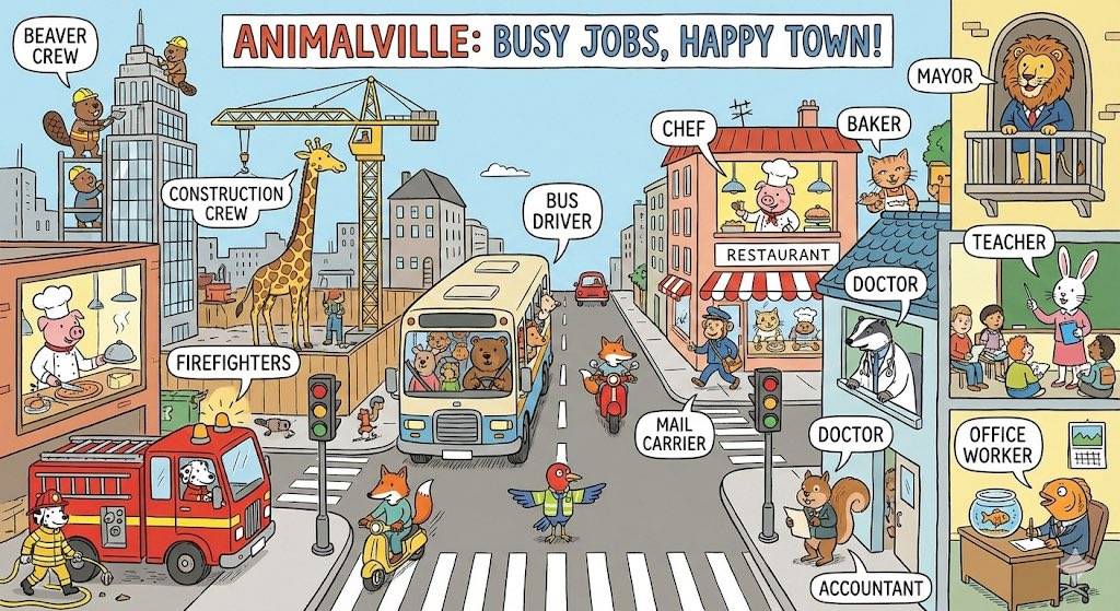 一张有趣的繁忙城镇信息图,展示动物们在繁忙城镇中上班的情景,并介绍它们从事的不同工作。