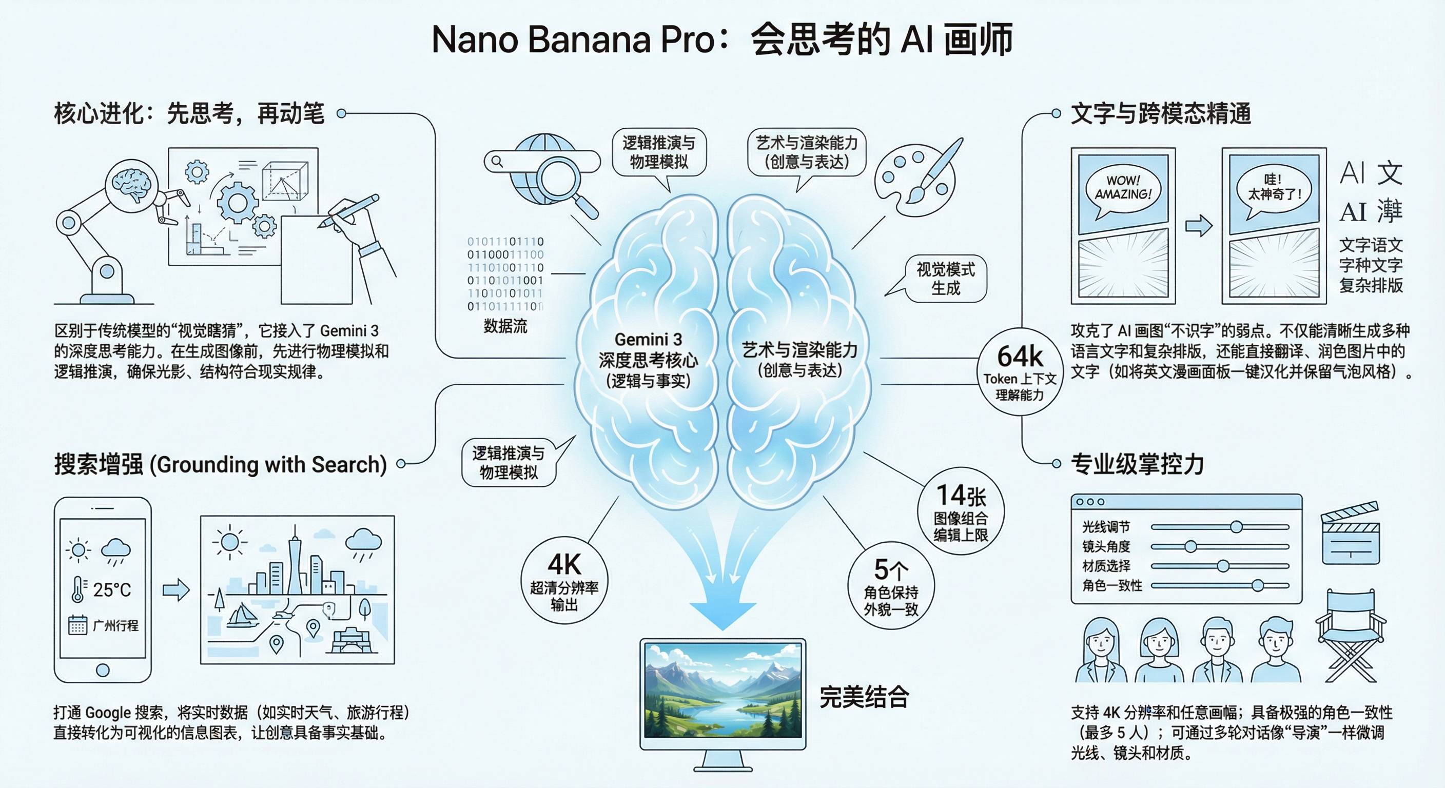 照着这种方法,我们把 Nano Banana Pro 发布的那篇文章丢给 Gemini,得到了下面这几张信息图。