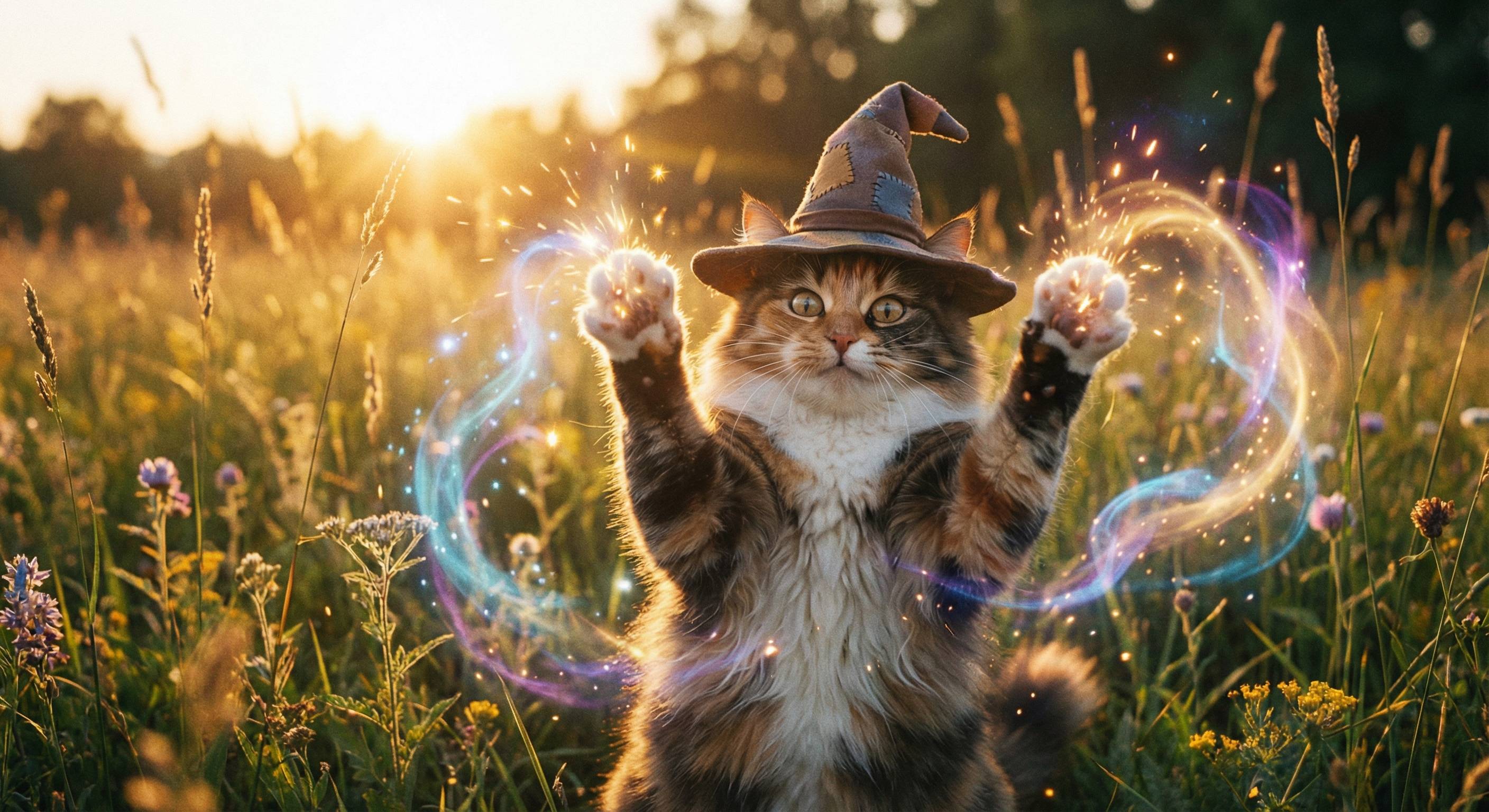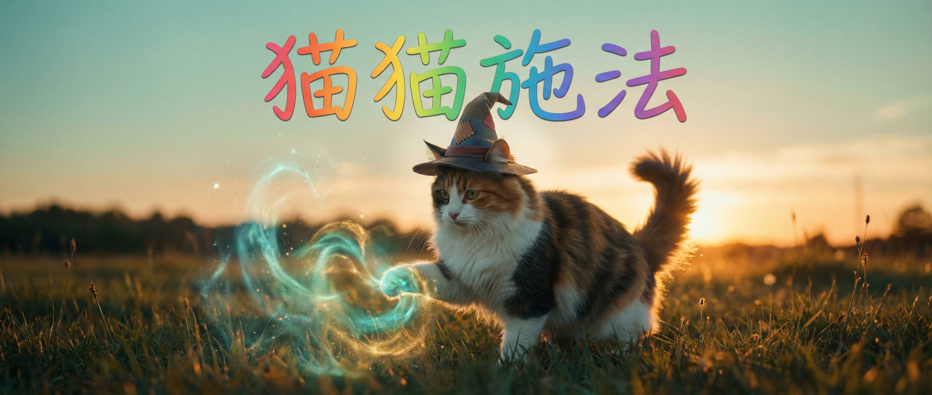 ▲举例:一只戴着小巫师帽的毛茸茸的三色猫,在日落时分阳光普照的草地上,施展着它的魔法,低角度镜头,浅景深(f/1.8)、黄金时段逆光营造长阴影、电影级调色,采用柔和的蓝绿色调。照片写实主义。21:9 电影宽镜头。标题「猫猫施法」以可爱的彩虹字体显示在顶部。