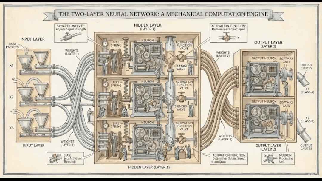 ▲ 图片来源:X@jon_barron|提示词:Generate a diagram of a two-layer neural network in the style of Stephen Biesty