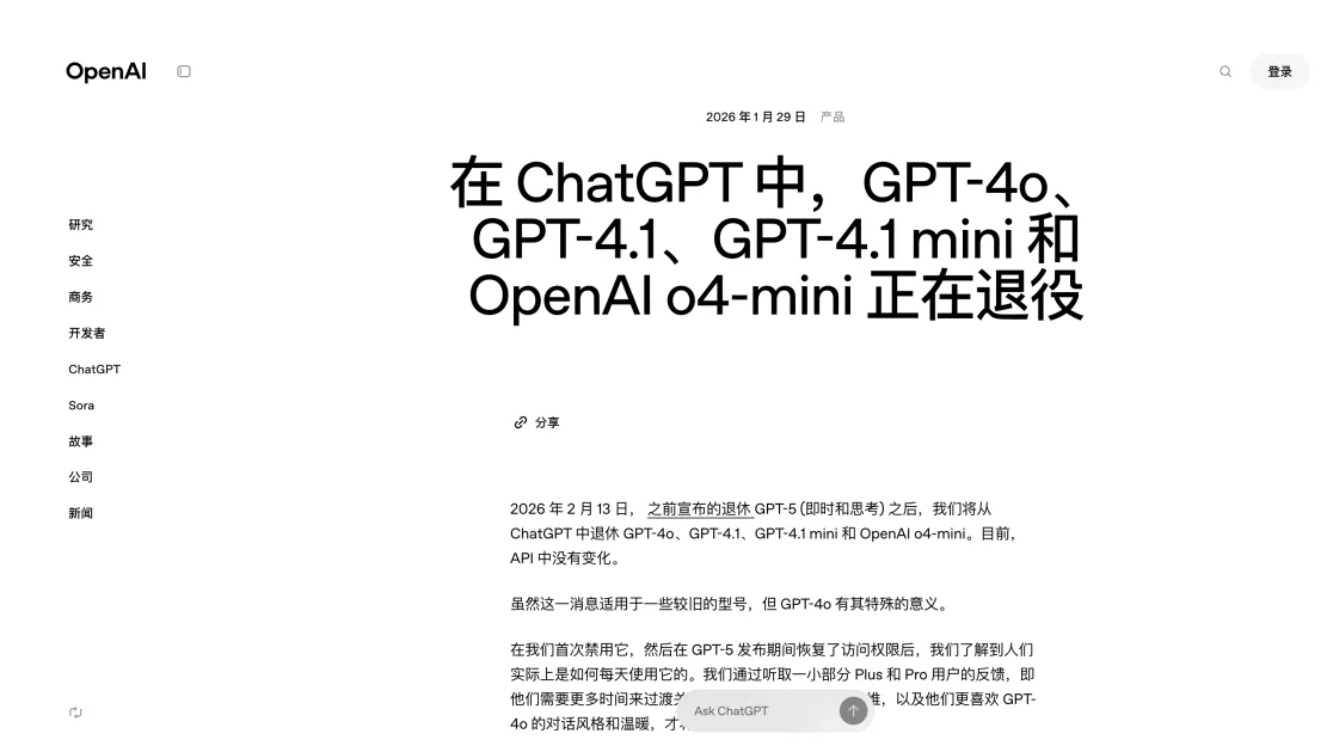 OpenAI 宣布将于 2026 年 2 月 13 日在 ChatGPT 中正式下线多款旧模型,包括 GPT‑4o、GPT‑4.1、GPT‑4.1 mini 以及 OpenAI o4‑mini,同时此前已公布的 GPT‑5 Instant 与 GPT‑5 Thinking 也将在同日退役。