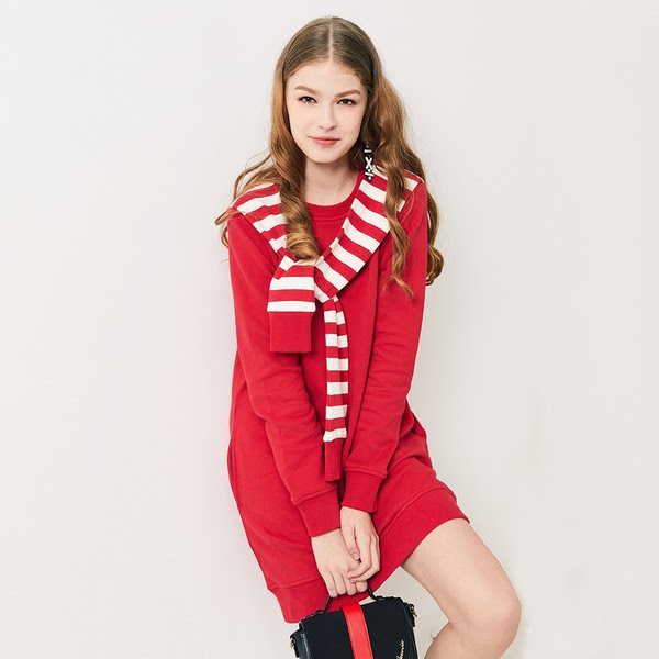 09 暖心卫衣正当时,中长款式正好抓住玩下装失踪秀美腿的好时机,红色燃起激情活力,肩上拼接两只袖子形成假两件效果,丰富了整体造型层次感,自然随性的青春气息扑面而来。