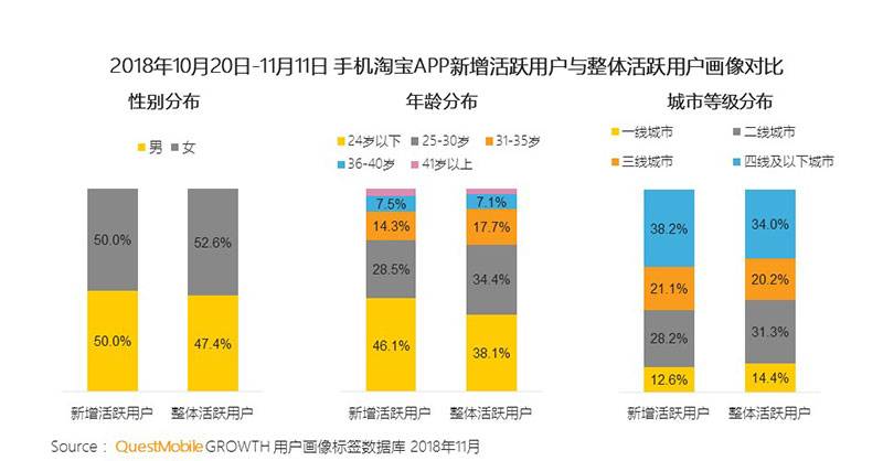 报告还给出了热衷双 11 人群的用户画像。以手淘为例,男性的比例已经接近 47.4%,双 11 期间新增的用户中,男、女比例相同,30岁以下的用户是手淘的主力军,占全体用户 7 成以上,三四线用户比例也在不断扩大,下沉趋势明显。