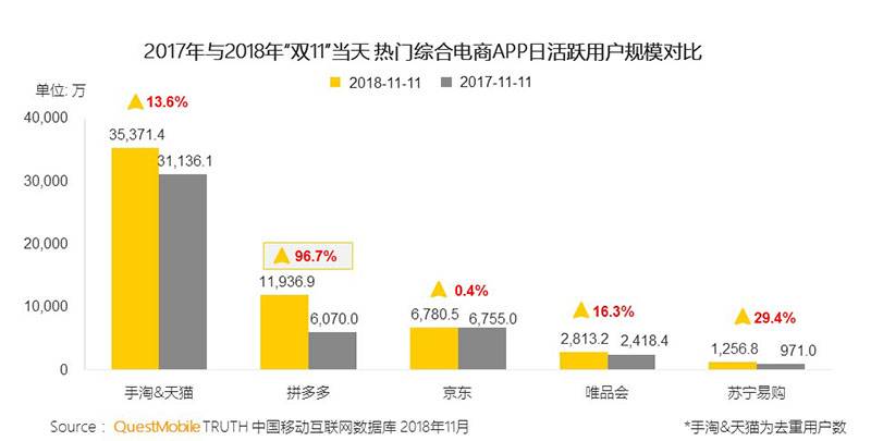 作为双 11 的发起者,淘宝和天猫依旧是这一天主角,日活达到 3.54 亿,同比增长 13.6%,但往年的「老二」京东的风头却被异军突起的拼多多抢去,后者 1.2 亿的日活几乎是京东的两倍,较去年双 11 亦翻了一倍,京东只有 0.4% 的同比增长,与拼多多上一年双 11 日活相近。