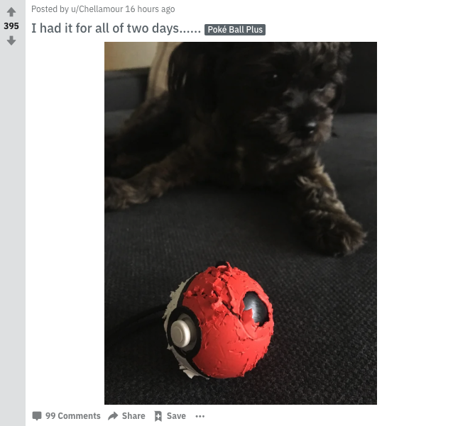 此外,精灵球 Plus 的强度也得不到保障,在 Reddit 上有玩家抱怨,如果稍不注意让家养的汪星人和精灵球 Plus 单独相处,那么等你回家的时候,精灵球 Plus 可能已经到处坑坑洼洼了。