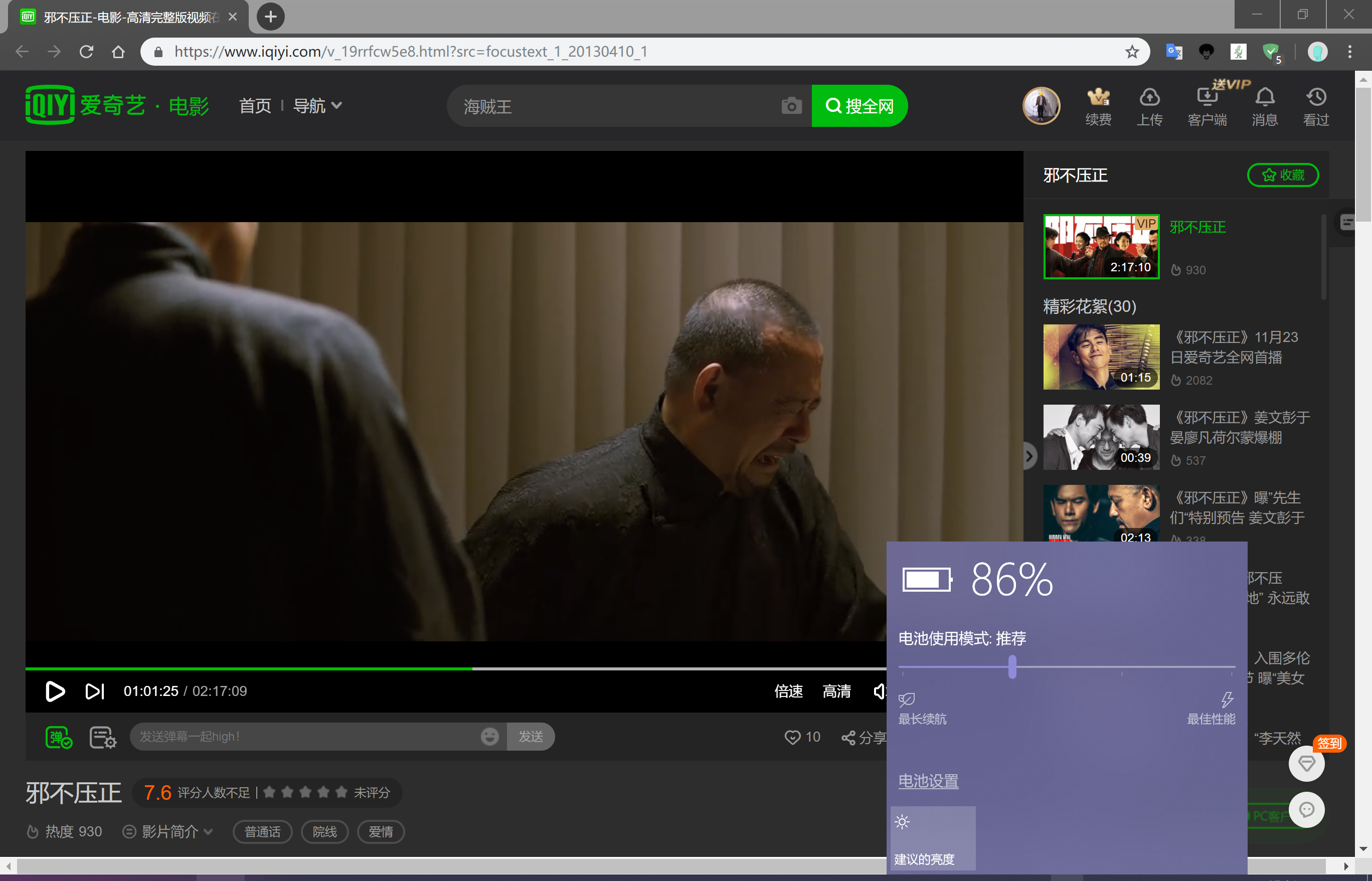 在屏幕亮度 50%、40% 性能(系统建议性能档)、连接 WiFi 的条件下,用 Chrome 打开爱奇艺播放 1080P 的电影,1 小时耗电约 14%。之后我用这台电脑在同样的模式下撰稿,用 Chrome 同时打开 6~10 个页面查资料,1 小时耗电约 12%。