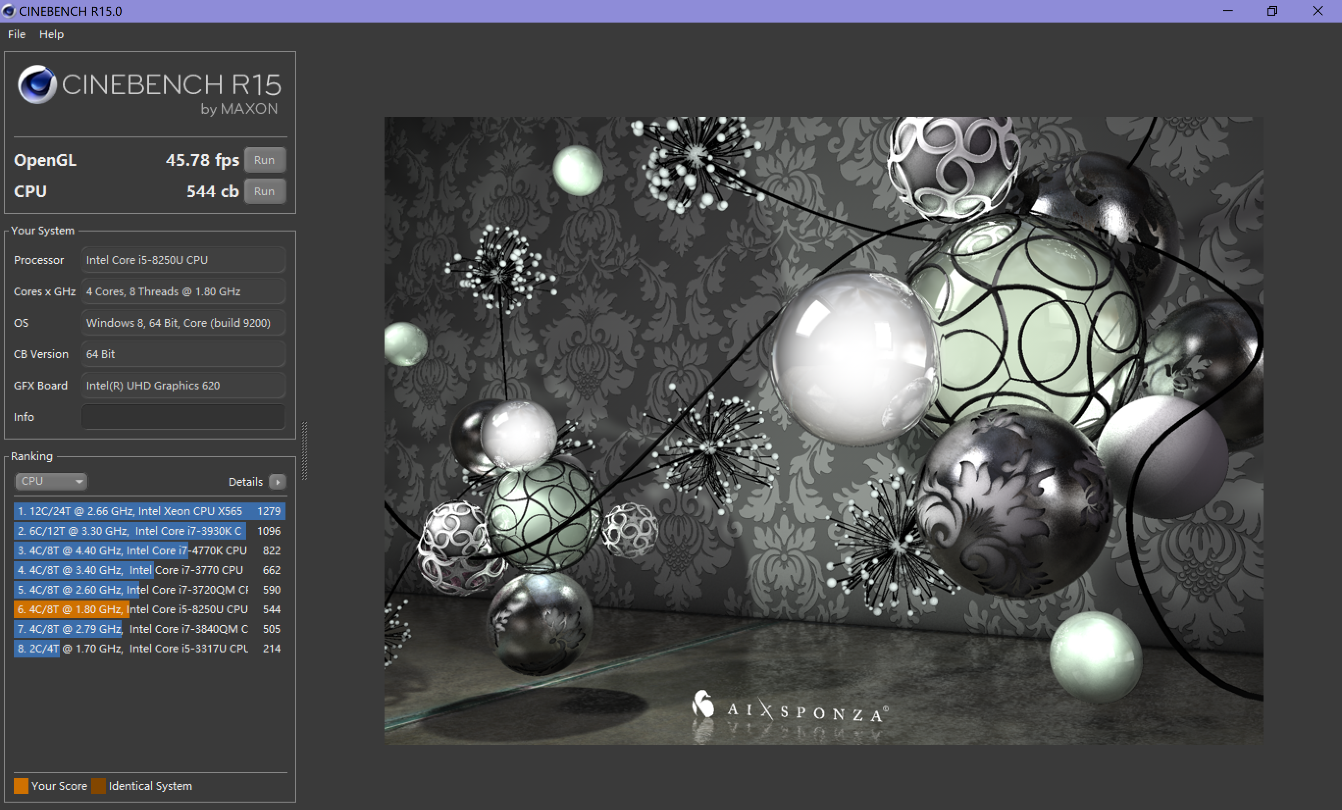 ▲ CineBench 测试成绩:OpenGL 45.78fps;处理器综合成绩 544cb。
