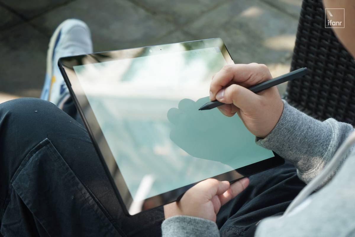 在这段时间里,平时在普通平板模式下,我会连接无线外设让主机和显示器实现双屏,比如我会将直播在主机全屏,在显示器上撰稿;再比如在大角度「工作室模式」下,这台电脑能变成一个角度舒适的手写板,我想美工或经常做笔记的用户都会喜欢这个设计。