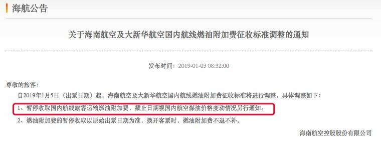 事实上,国际原油价格在 2018 年末一路走低,本次取消燃油费也在意料之内,南航和海航等 9 家航司已正式对外发布公告,其他航司预计也将于今明两天跟进。这两天打算买机票的朋友,不妨等到 1 月 5 日再行动。