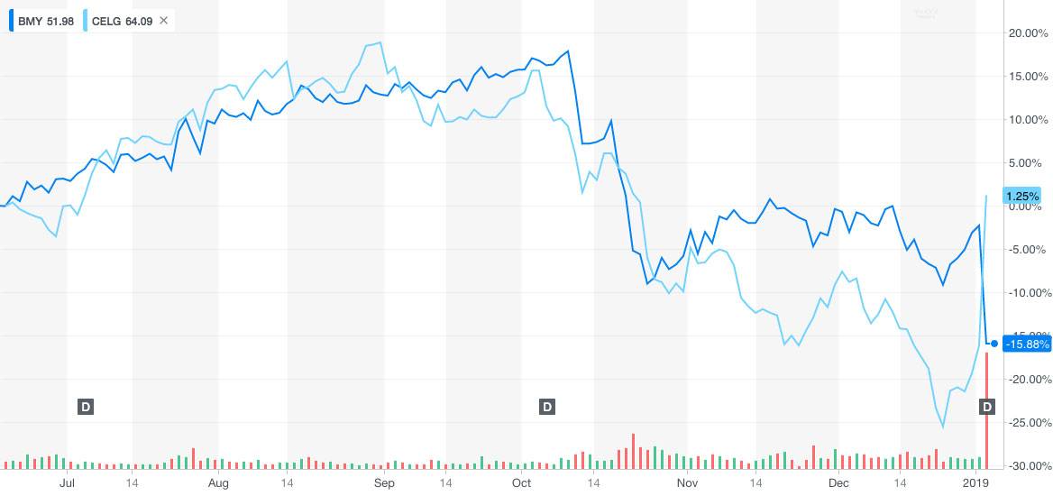 百时美施贵宝和新基的股价在 2018 年分别下跌 15.2% 和 40%,不过在公布收购后,新基的股价暴涨 20.7%,收盘于 89.43 美元,但百时美施贵宝却大跌超过 13%。