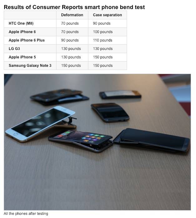 此后,《消费者报告》也曾对这个问题做过一次实验。他们发现,如果你想将 iPhone 6 掰弯,需要近 70 磅(31.8kg)的压力,而将 iPhone 6 Plus 掰弯则需要 90 磅(40.8 kg),此时铝合金机身会出现弯曲。