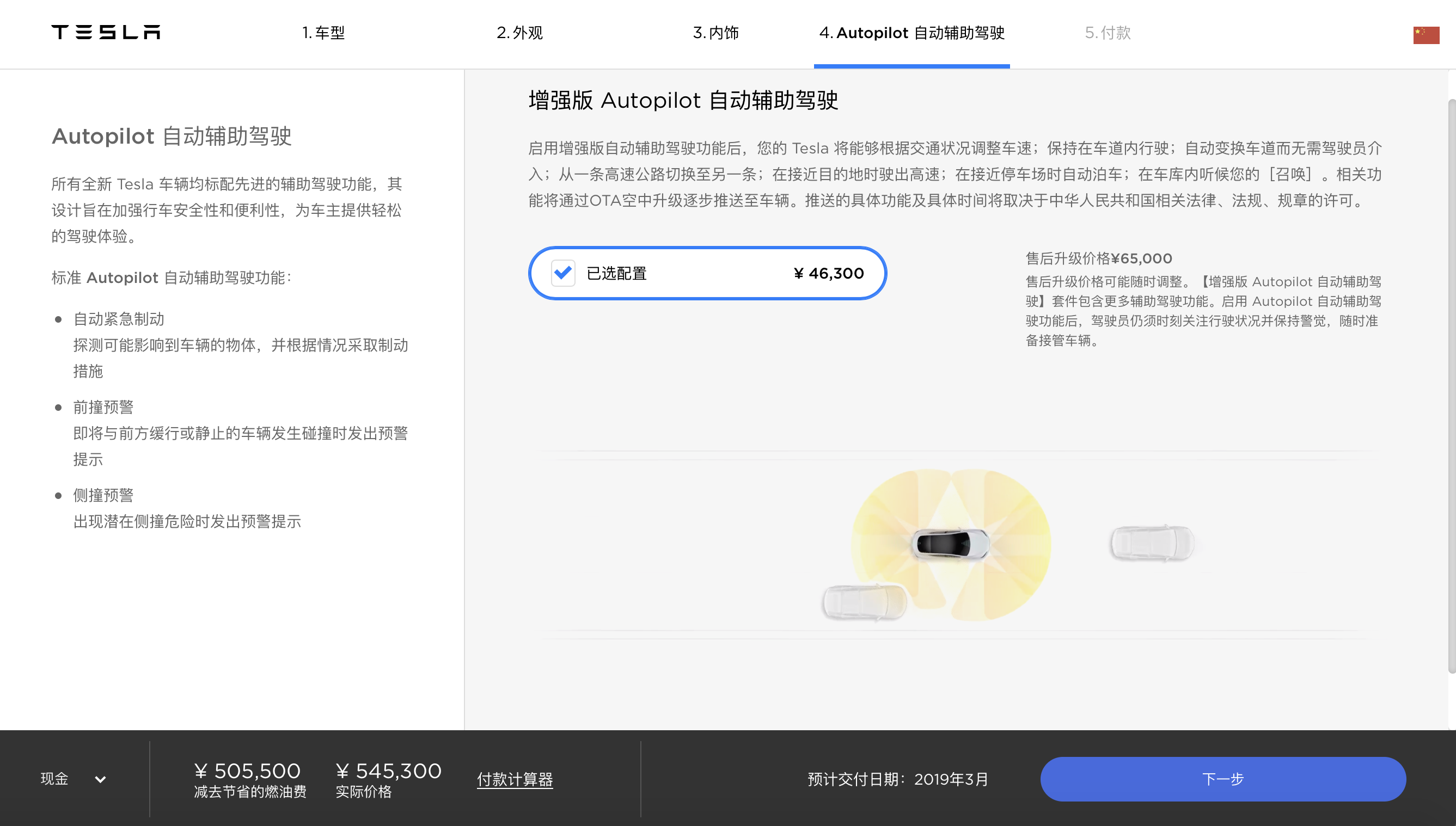 什么?你买特斯拉居然 Autopilot 都不选?四万六千三必须选啊!浓缩了无数特斯拉工程师心血的高科技,没了 Autopilot 还能叫特斯拉吗?现在不选别后悔,提了车官方后装可是要六万五的。