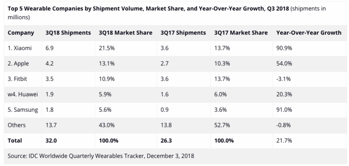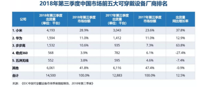 根据 IDC 的报告,2018 年第三季度可穿戴设备出货量排名前五的分别是小米、苹果、Fibit、华为以及三星。而在国内出货量排名前五的则分别是小米、华为、步步高、奇虎 360 以及五洲无线。