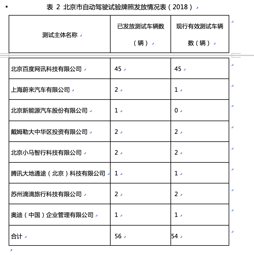 (其实北京总共有 56 台拥有测试牌照,不过蔚来的一辆车和北汽新能源的唯一一台车没有进行有效的测试)