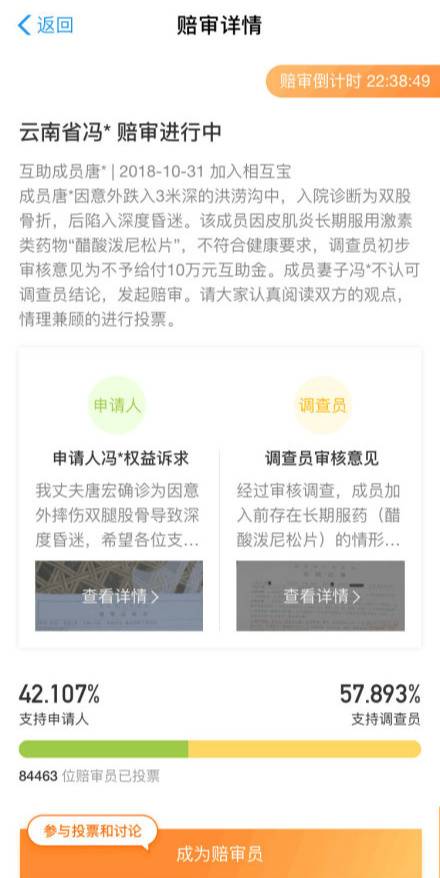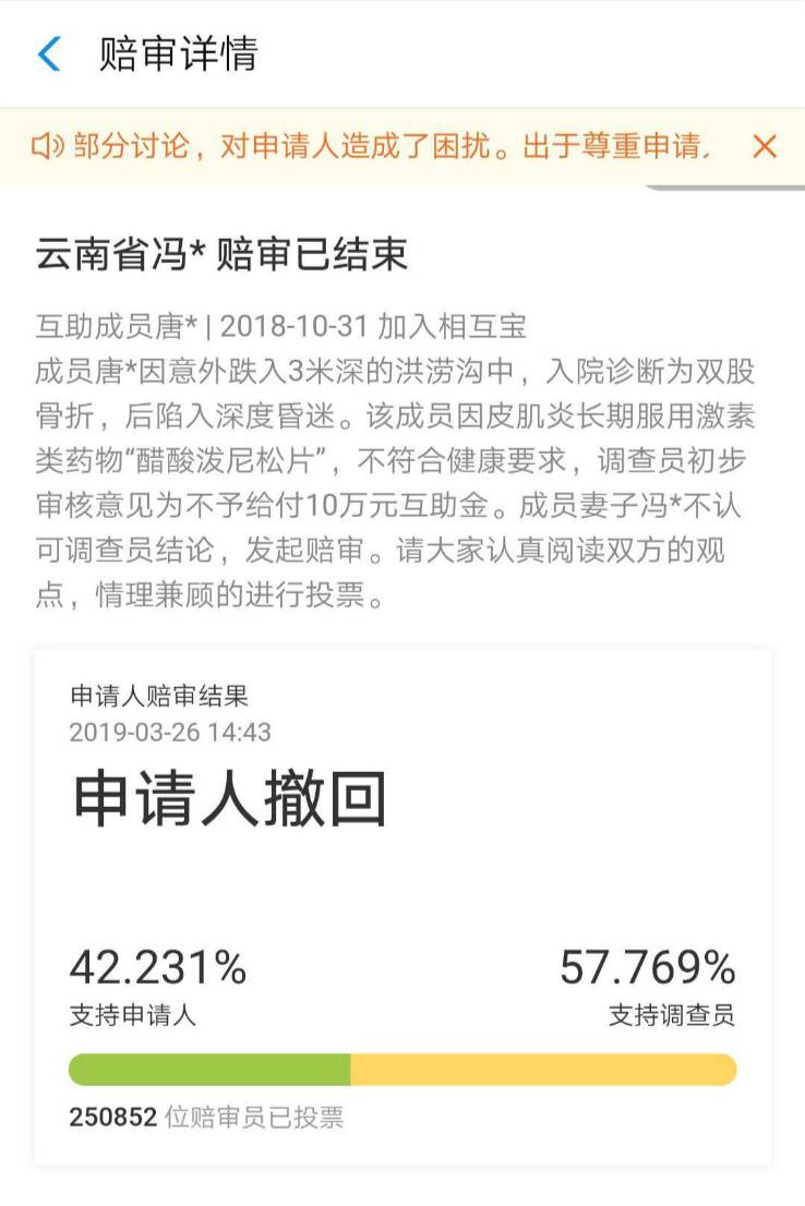 根据相互宝的数据,这起赔审上线不到 5 小时,超过 25 万赔审员参与投票,其中 58% 的人投下了反对票,比票数更胶着的是正反两方的观点交锋,超过 80 万用户参与讨论,最终以申请人主动撤回赔审申请告终,相互宝也维持了原来的调查结果。