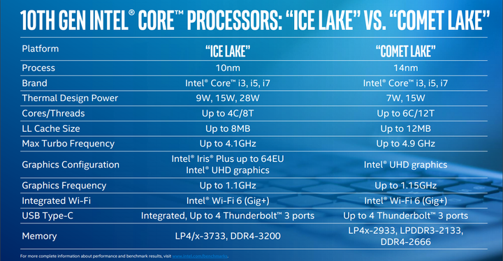 Ice Lake 的定位是智能、性能的响应速度和娱乐体验,它适合于台式 PC 或高端笔记本使用;而 Comet Lake 的定位是多线程生产力工作,在功耗保持与前代不变的 7W 和 15W 条件下增加了核心数量,而且单核频率也提升到了 4.9GHz。